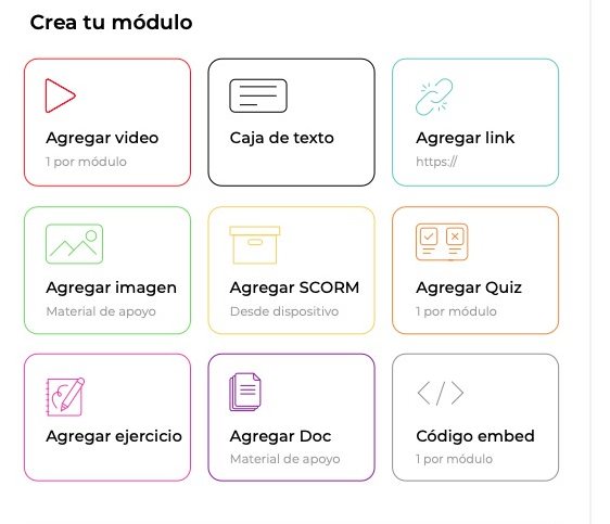 Tus cursos se dividen en módulos, los cuales puede incluir contenido en formato de: texto, descarga, video o scorm. También puedes crear preguntas como quiz dentro de cada módulo, y un examen final. Tus equipos dan retroalimentación del curso y tienes una sección específica para ver sus dudas y comentarios.